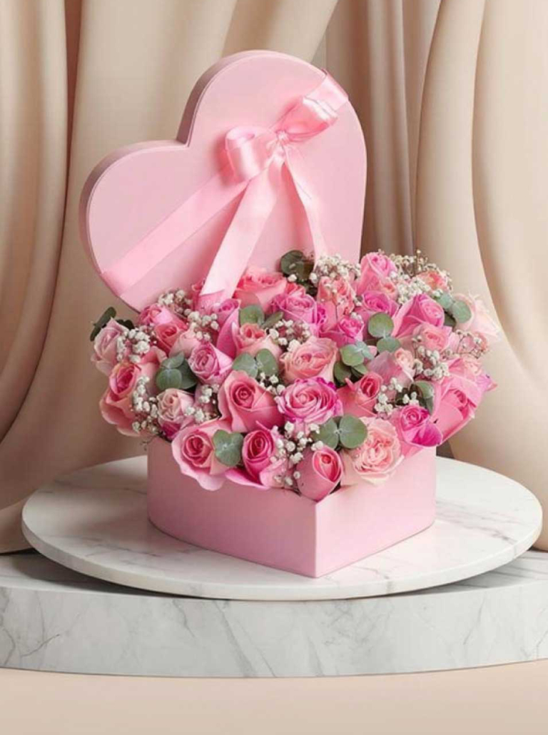 Diseño floral de autor en caja, de estética romántica y delicada, compuesto por rosas en tonos rosado suave y rosado intenso que crean una composición armónica, elegante y profundamente femenina. Una pieza que evoca ternura, amor y sofisticación, ideal para expresar sentimientos desde la sutileza y la belleza.