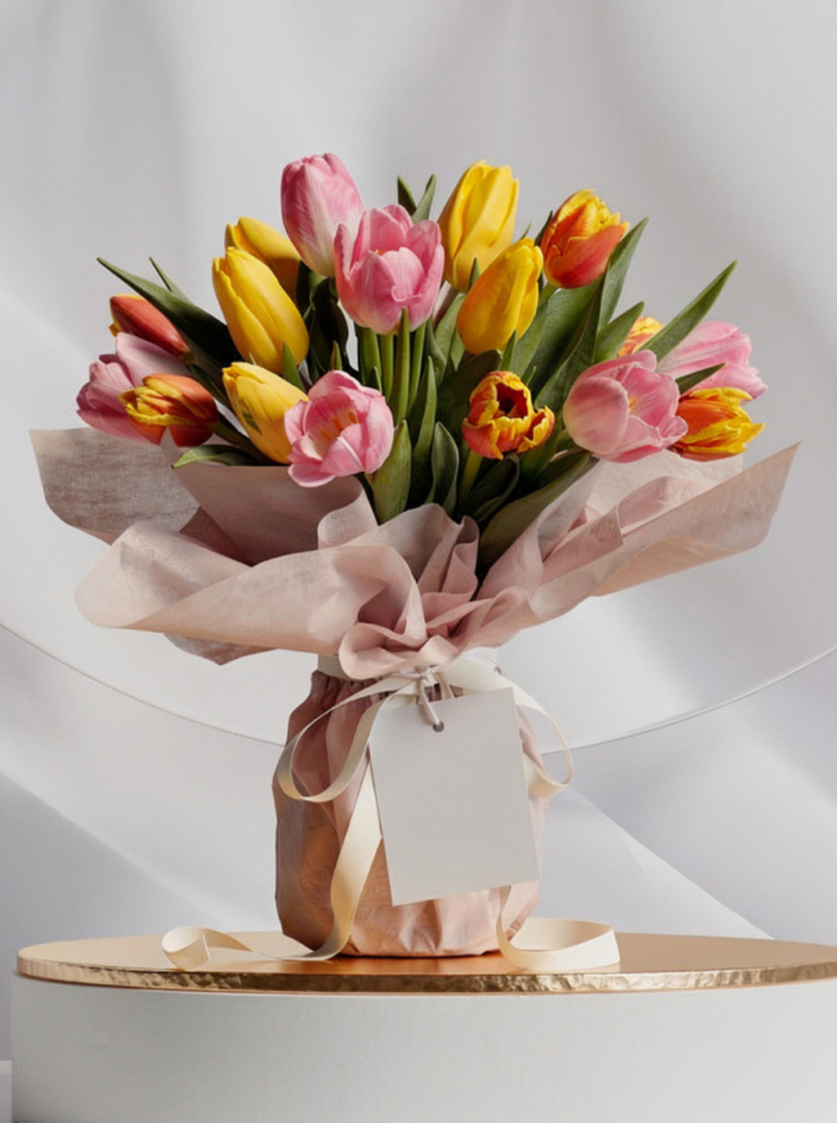 Tipo de flores: Tulipanes (colores disponibles según disponibilidad: rojos, rosados, blancos, amarillos, fucsias, morados y combinados)