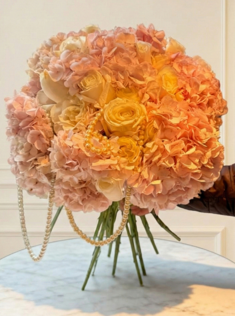 Bouquet de autor con una composición elegante y sofisticada que combina distintas flores en tonos suaves y cálidos, integrando texturas delicadas y detalles en perlas que aportan un acabado romántico, luminoso y altamente refinado.