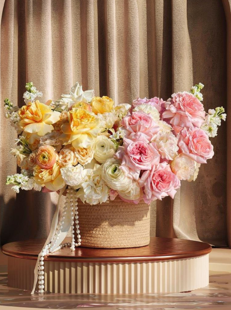 Diseño floral en canasta de fibras naturales, compuesto por una armoniosa mezcla de flores en tonos rosa y amarillo, realzada con delicados detalles de perlas que aportan un aire romántico, luminoso y sofisticado. Una composición equilibrada y elegante que celebra la suavidad del color, la riqueza de las texturas y la belleza de las flores en conjunto.