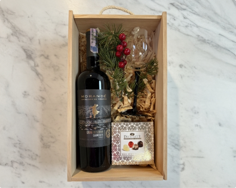 Una invitación a disfrutar de los pequeños placeres de la vida con elegancia y sencillez. Este obsequio combina el encanto de un buen vino con la dulzura de los chocolates finos, creando el detalle perfecto para celebrar, compartir o agradecer en cualquier ocasión especial.